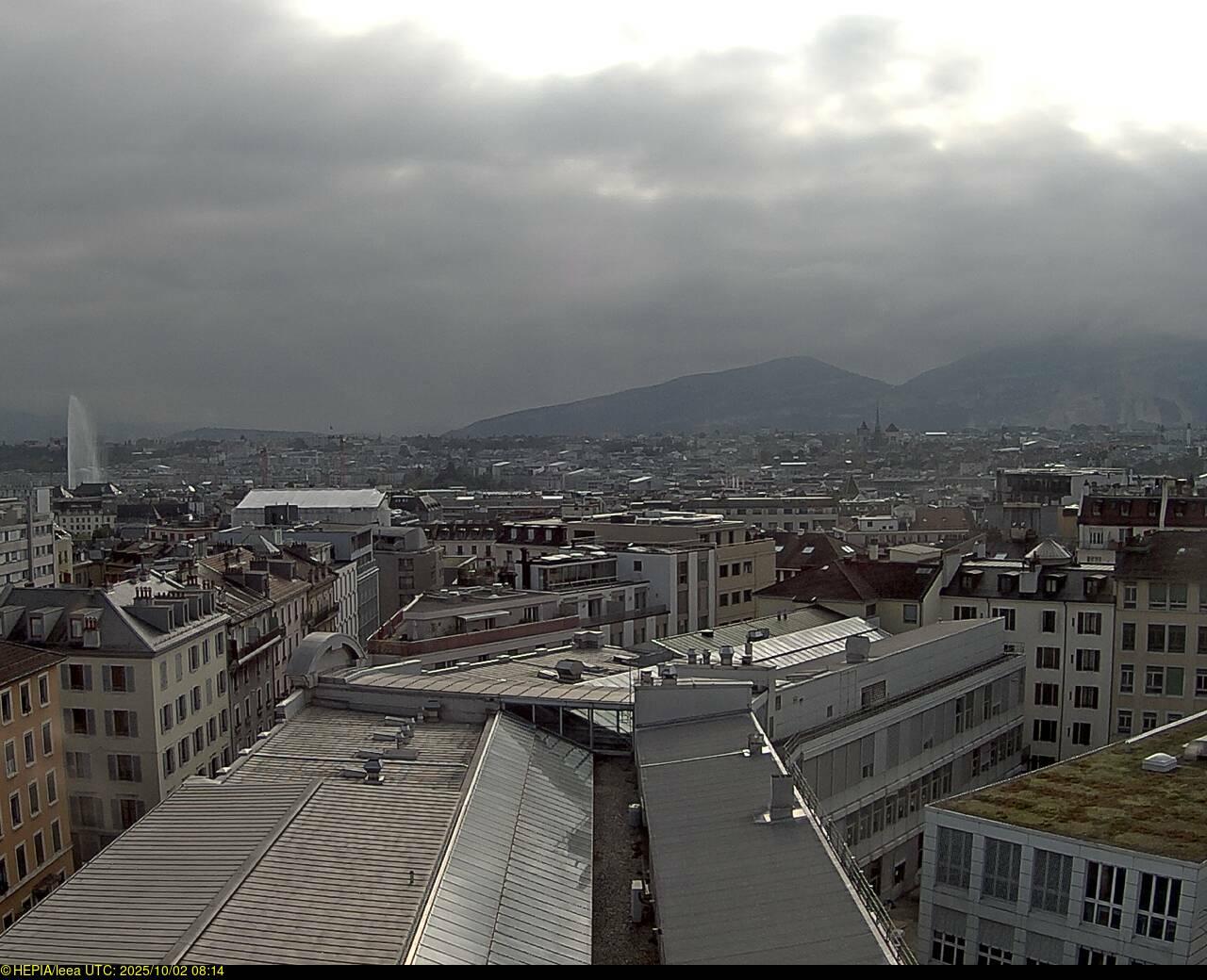 webcam haute définition avec vue sur la ville, jet d'eau, Alpes (image actualisée toutes les 10 minutes, archives horaires, animation)